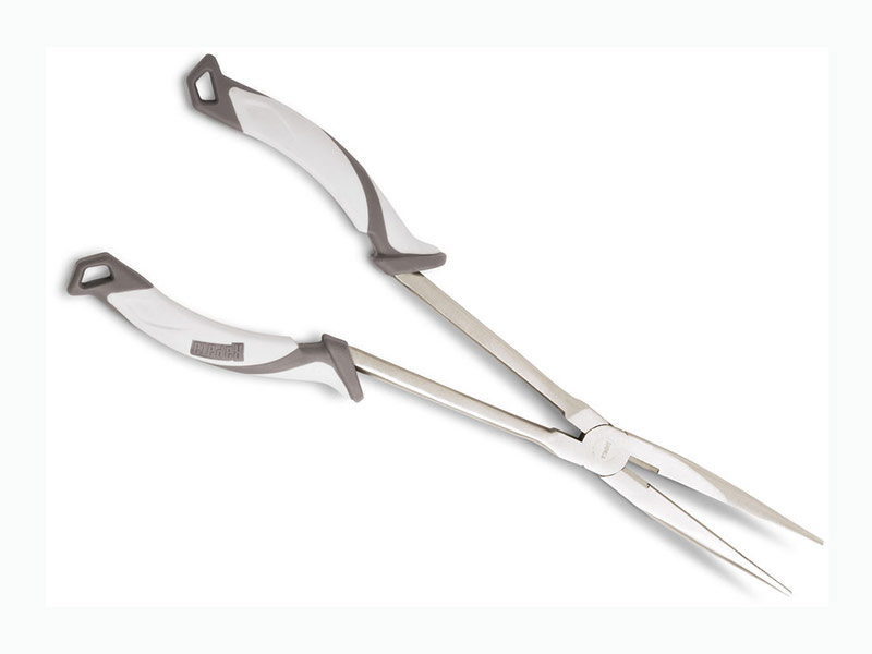 RAPALA ANGLERS' PLIERS 11''. Easily reach deep hooked baits and other hard-to-reach hooks with ease. Coastal color co-molded grips for a secure hand while digging deep to save your “lucky Rapala” lure. Line and hook side cutter. Nickel-plated carbon steel construction to enhance rust resistance.