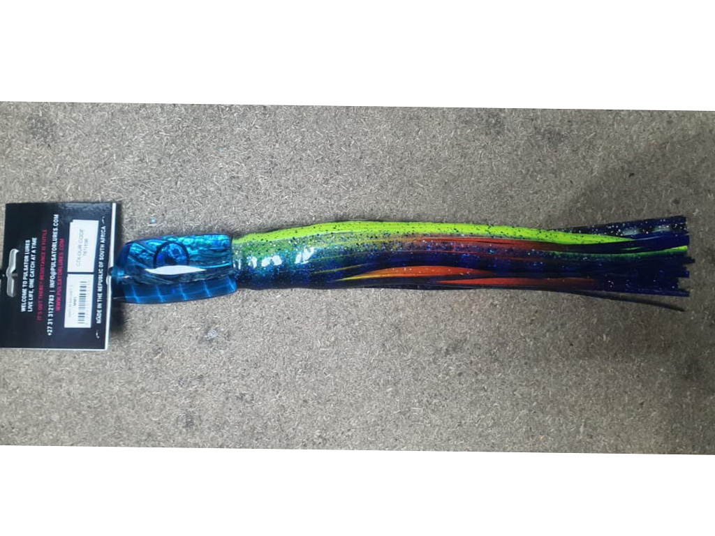 Red hot lure for blue marlin in the two bigger sizes. It’s aggressive long surface swimming action will keep you on the edge of your seat as you watch and wait for that big blue to pounce on it. The two smaller sizes work just as well on black and striped marlin. Run lures in moderate sea conditions and pull them from outriggers.